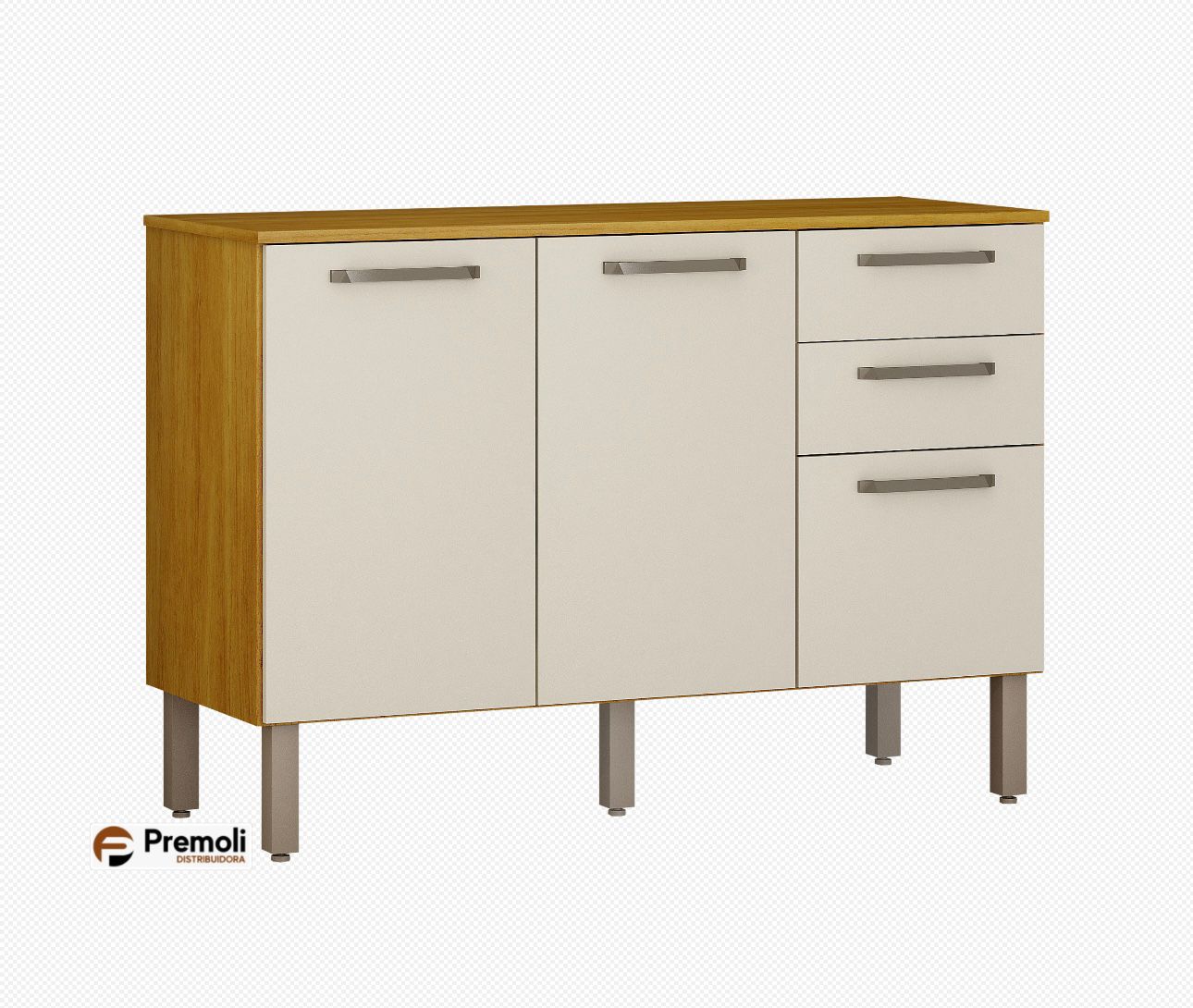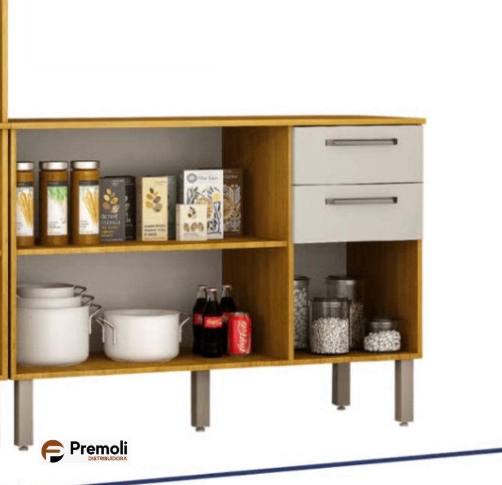 Balcão 3 portas e 2 gavetas com corrediças telescópicas e divisor de talheres, oferecendo praticidade e organização no dia a dia. Conta com pés reguláveis, que permitem fácil nivelamento em qualquer superfície.