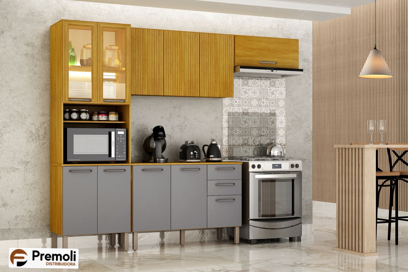 Com pés reguláveis, dobradiças metálicas e nicho para geladeira equipado com pistão a gás, a Cozinha Malta se destaca pelo excelente aproveitamento interno e pela sofisticada combinação de tons, que conferem modernidade, leveza e elegância a qualquer ambiente.