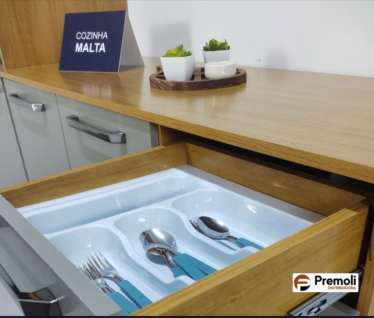Balcão 3 portas e 2 gavetas com corrediças telescópicas e divisor de talheres, oferecendo praticidade e organização no dia a dia. Conta com pés reguláveis, que permitem fácil nivelamento em qualquer superfície.