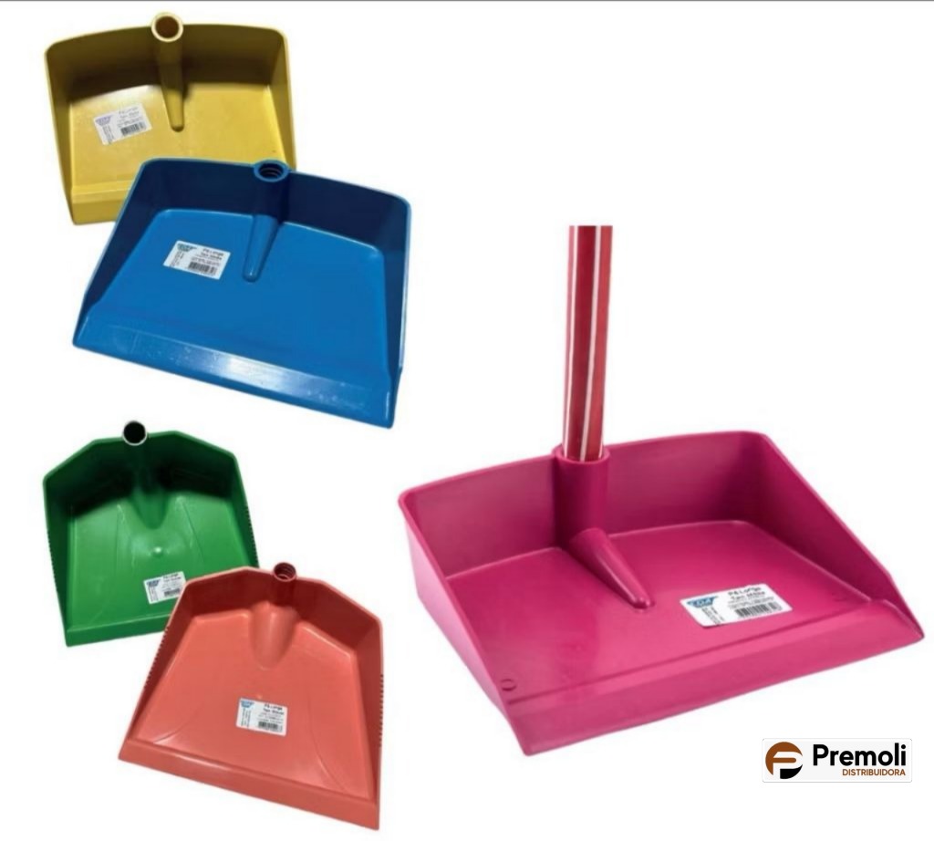 A imagem exibe pás de lixo plásticas com cabo longo, da marca Premoli. Essas ferramentas são práticas e ergonômicas, projetadas para facilitar a limpeza sem a necessidade de se abaixar.