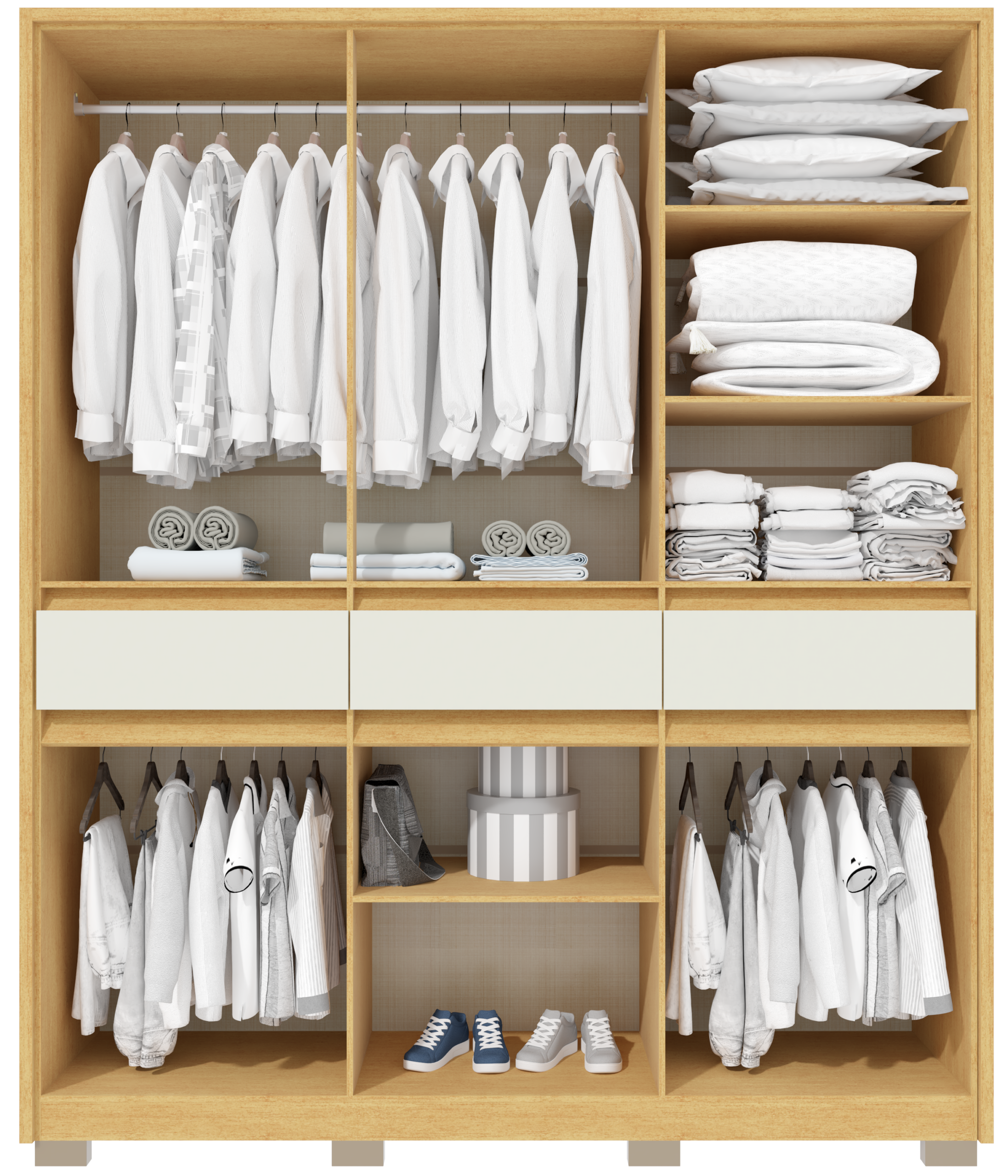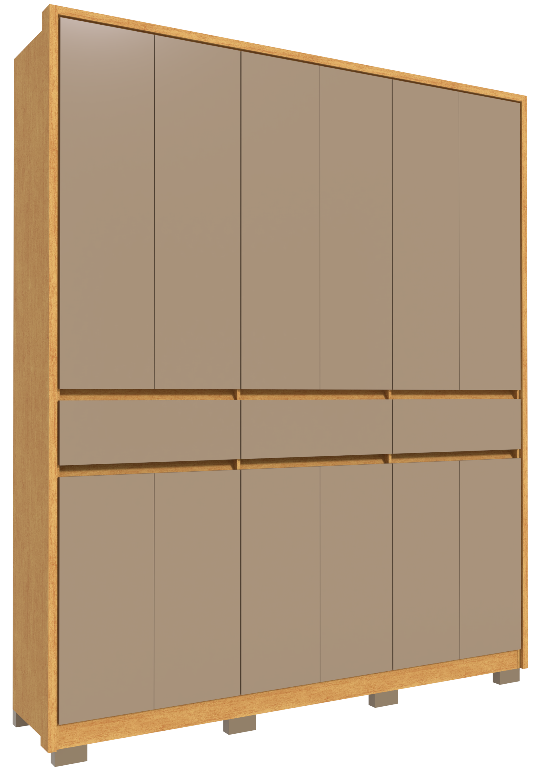 O Roupeiro Havana foi projetado para ser o protagonista do seu setor de dormitórios. Com um design clean e simétrico de 6 portas, ele entrega a imponência que o cliente busca para preencher o ambiente com sofisticação. O grande trunfo comercial aqui é o acesso facilitado: as 3 gavetas externas centrais permitem que o usuário organize itens do dia a dia sem precisar abrir o móvel, um argumento de praticidade imbatível no PDV. É o produto estratégico para o lojista que busca alto volume de vendas, oferecendo um móvel robusto com excelente percepção de valor