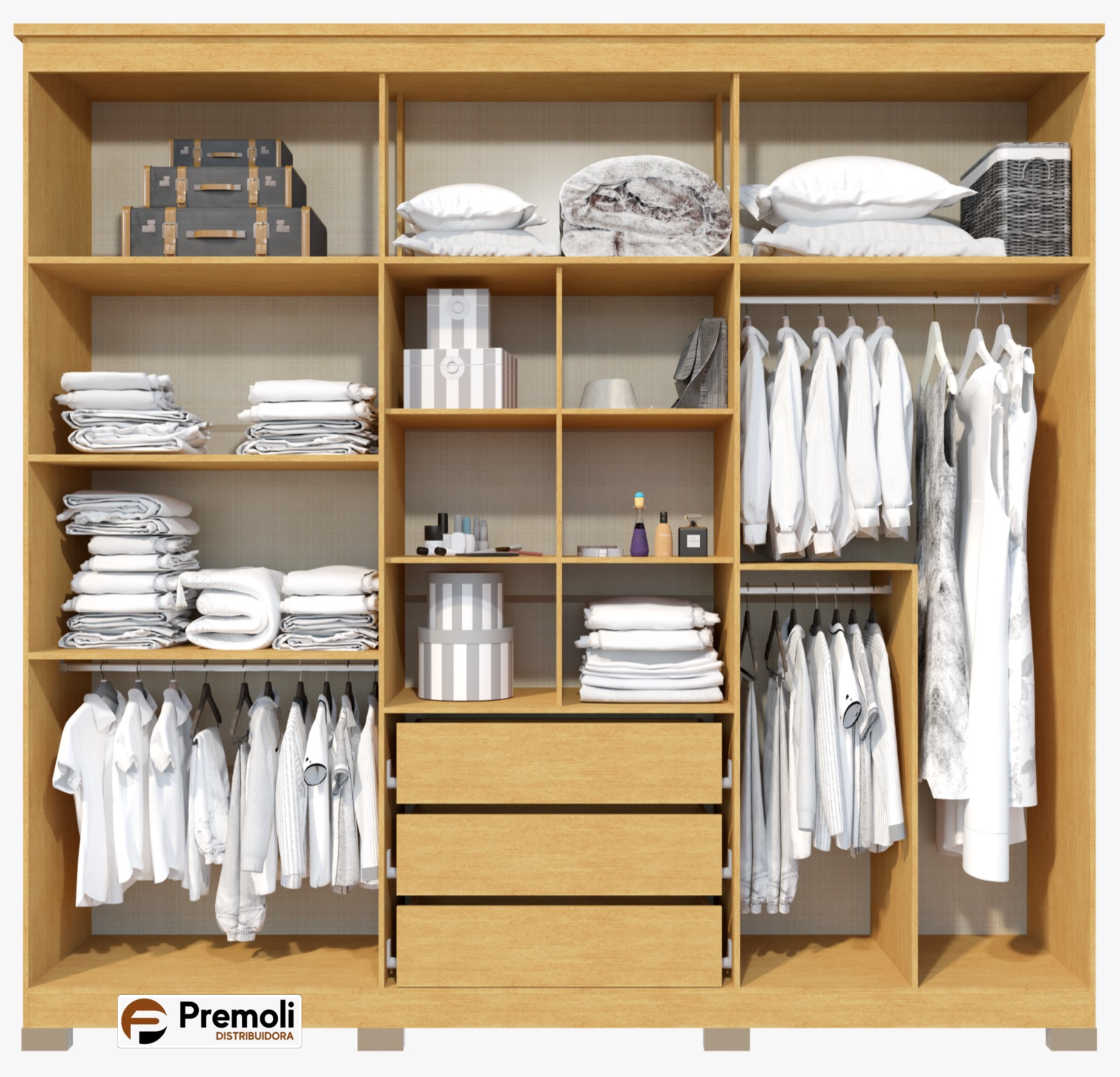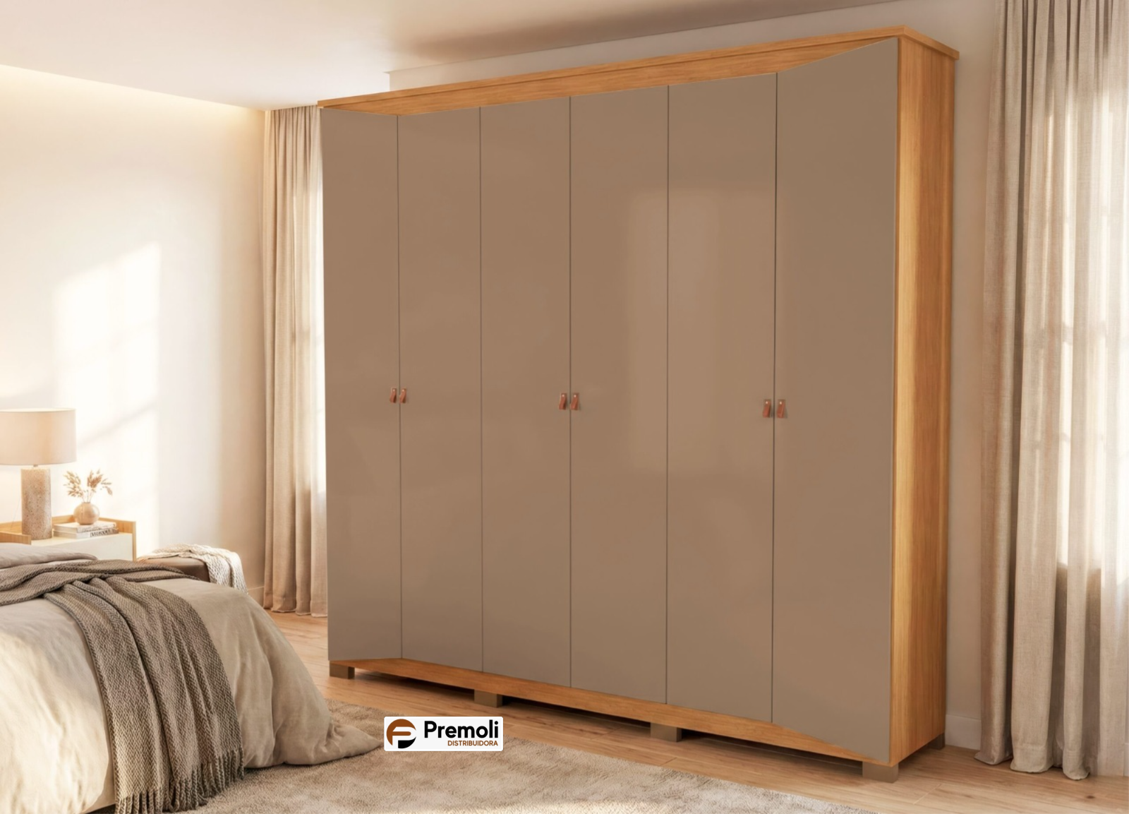 Roupeiro Torino: Sofisticação Arquitetônica e Organização Superior O Roupeiro Torino é a escolha definitiva para lojistas que buscam produtos com alto valor agregado e design autoral. Seu diferencial visual é marcante: as portas laterais em ângulo criam uma moldura sofisticada que foge do óbvio, conferindo um ar arquitetônico ao móvel. Complementado por elegantes puxadores em estilo couro, o Torino atrai o olhar pela exclusividade. Internamente, o projeto não decepciona, oferecendo uma setorização inteligente com nichos multifuncionais, três gavetas centrais e amplo espaço para vestidos longos. Um produto robusto que garante destaque em qualquer showroom e satisfação para os clientes mais exigentes.